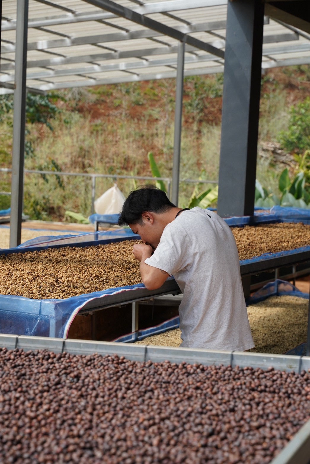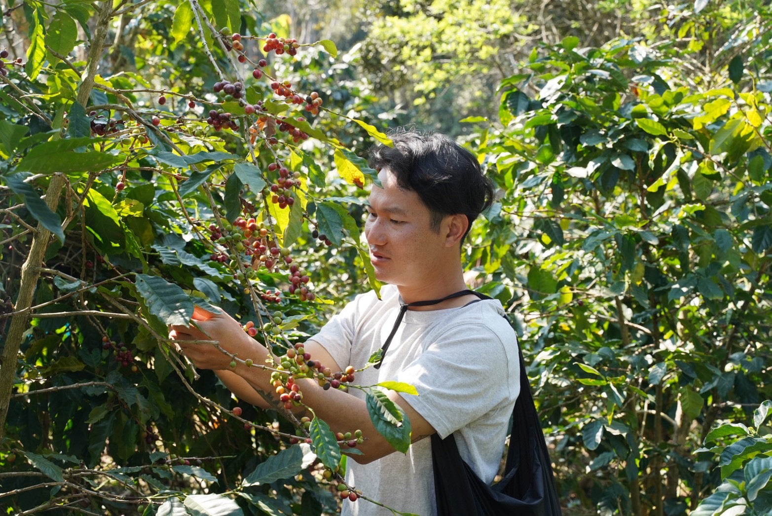 Doi Chang村の若手生産者であり、オーナー•Jennyの弟でもあるアピワット。元々はチェンマイのアカアマコーヒーでバリスタ兼焙煎士として働いていたアピワットは、オーストラリアのメルボルンとシドニーで1年ほどコーヒーを学んだ後、村に戻り自らコーヒー豆の生産を始めました。 普段は村で生活し、自身のコーヒーショップもオープンしたアピワット。チェンマイ•オーストラリアでバリスタとして働いている時に自ら築き上げたネットワークから常に最新の情報を入手し、アカアマコーヒーのバリスタとも連携しながら、常に美味しいコーヒーを栽培する研究を重ねています。